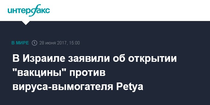 Москва. 28 июня. INTERFAX.RU - Израильский исследователь в области компьютерной безопасности открыл метод, который блокирует доступ вирусу Petya, обманывая его, сообщает в среду израильская газета Haaretz.