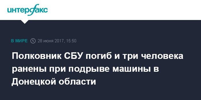 Москва. 28 июня. INTERFAX.RU - На Украине в районе Константиновки (Донецкая область) был подорван автомобиль, в результате чего погиб полковник Службы безопасности Украины, еще три человека получили ранения, сообщает пресс-центр СБ Украины.