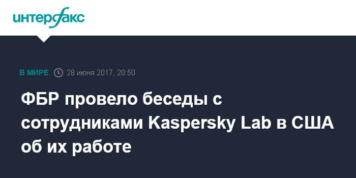 Москва. 28 июня. INTERFAX.RU - Сотрудники ФБР в рамках контрразведывательного расследования провели беседу с рядом сотрудников компании Kaspersky Lab в США по поводу деятельности их компании, сообщает американский телеканал NBC со ссылкой на неназванные источники.