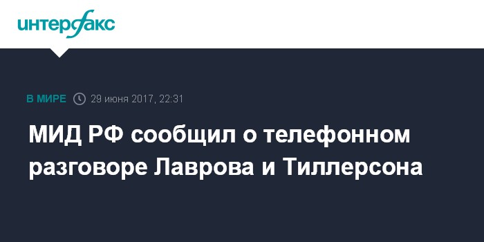 "Вечером 29 июня по американской инициативе состоялся телефонный разговор Министра иностранных дел Российской Федерации С.В.Лаврова с Государственным секретарем США Р.Тиллерсоном. Обсуждались актуальные вопросы российско-американской повестки дня", - отмечается в сообщении.