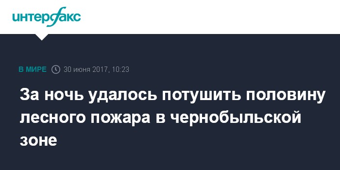 Москва. 30 июня. INTERFAX.RU - За ночь площадь пожара в Лубянском лесничестве в чернобыльской зоне отчуждения удалось уменьшить с 25 до 12 га, сообщается на официальном сайте ГСЧС Украины в пятницу.