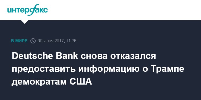 Москва. 30 июня. INTERFAX.RU - Deutsche Bank снова отказал американским конгрессменам-демократам информации по кредитам, выданным президенту США Дональду Трампу, сообщив, что передача подобных документов была бы противозаконна. Как пишет агентство Bloomberg, юристы банка отметили, что конфиденциальная финансовая информация не может предоставляться отдельным членам Конгресса, но не исключили передачу документов в ответ на официальный запрос комитета Конгресса.