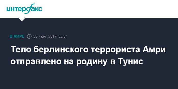 Москва. 30 июня. INTERFAX.RU - Тело выходца из Туниса Аниса Амри, совершившего теракт на рождественском базаре в декабре в Берлине, возвращено на его родину, сообщает в пятницу итальянское агентство АНСА.