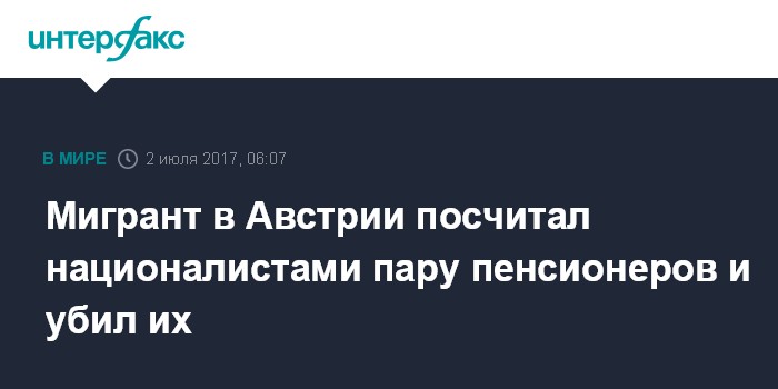 Москва. 2 июля. INTERFAX.RU - Уроженец Туниса, с 1989 года живущий в Австрии, сознался в убийстве пожилой пары из города Линц. Мотивом преступления послужила ненависть к националистам — 54-летний мужчина посчитал, что пенсионеры поддерживали ультраправую Австрийскую партию свободы, передает ORF.