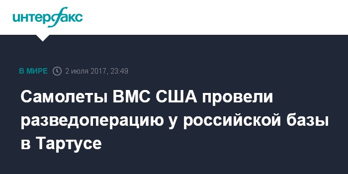 Москва. 2 июля. INTERFAX.RU - Американские военные самолеты в воскресенье совершили очередные разведывательные полеты вблизи военно-морской базы России в сирийском порту Тартус, свидетельствуют данные западных сайтов, отслеживающих передвижения военной авиации.