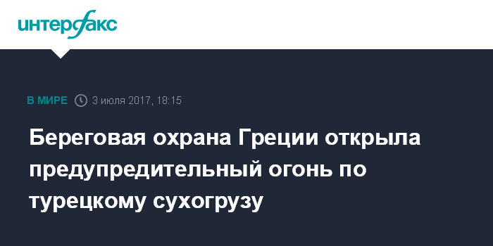Москва. 3 июля. INTERFAX.RU - С катера береговой охраны Греции в понедельник был открыт предупредительный огонь по грузовому судну под турецким флагом, пишет издание The Daily Sabah.