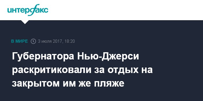 Москва. 3 июля. INTERFAX.RU - Губернатор американского штата Нью-Джерси Крис Кристи подвергся резкой критике за семейный отдых на пляже, который он ранее закрыл для публичного посещения, сообщает в понедельник BBC News.