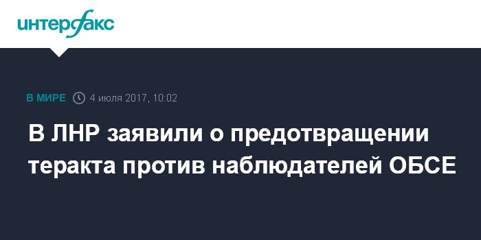 Москва. 4 июля. INTERFAX.RU - Сотрудники министерства государственной безопасности (МГБ) самопровозглашенной Луганской народной республики предотвратили террористический акт против наблюдателей Специальной мониторинговой миссии (СММ) ОБСЕ в Луганске, сообщили "Интерфаксу" в МГБ ЛНР.