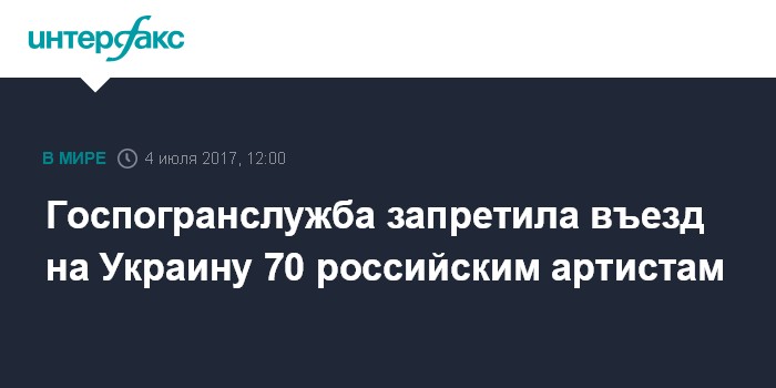 Москва. 4 июля. INTERFAX.RU - Государственная пограничная служба Украины ввела запрет на въезд в Украину 70 российским артистам, сообщил "Интерфаксу" спикер ведомства Олег Слободян, не назвав их имен.
