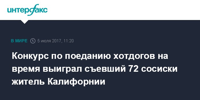 Конкурс по поеданию хотдогов на время выиграл съевший 72 сосиски житель Калифорнии