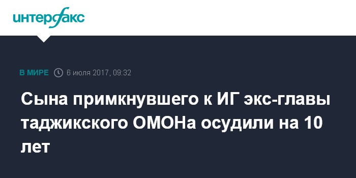 Москва. 6 июля. INTERFAX.RU - Старший сын бывшего командира таджикского ОМОНа Гулмурода Халимова, перешедшего на сторону террористической организации "Исламское государство" (ИГ, запрещена в РФ), Бехрузи Гулмурод приговорен к 10 годам лишения свободы.