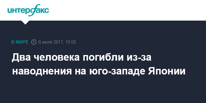 Москва. 6 июля. INTERFAX.RU - По меньшей мере, два человека погибли на острове Кюсю на юго-западе Японии в результате наводнения, вызванного ливневыми дождями, сообщают в четверг японский телеканал NHK.