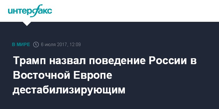 Москва. 6 июля. INTERFAX.RU - Президент США Дональд Трамп, выступая в четверг в Варшаве, выразил мнение, что действия России в Восточной Европе носят дестабилизирующий характер.