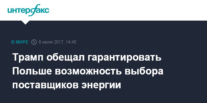 Москва. 6 июля. INTERFAX.RU - Президент США Дональд Трамп заявил во время выступления в Варшаве, что задача США - гарантировать Польше и прочим странам региона альтернативу в поставках энергии.