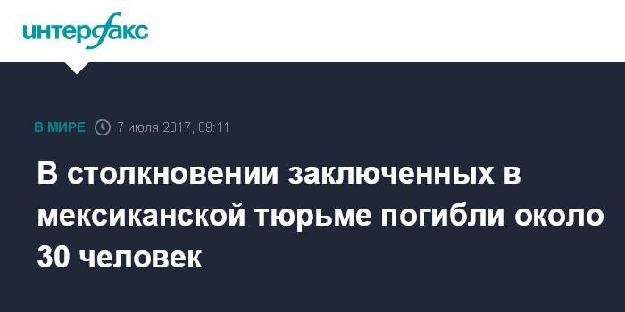 Москва. 7 июля. INTERFAX.RU - Не менее 28 заключенных погибли во время потасовки между представителями противоборствующих преступных кланов в одной из тюрем мексиканского штата Герреро, сообщил журналистам представитель службы безопасности штата Роберто Альварес.