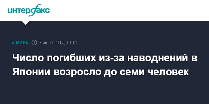 Москва. 7 июля. INTERFAX.RU - Число жертв наводнений на острове Кюсю (юго-запад Японии) увеличилось до семи человек, сообщает в пятницу японский телеканал NHK.