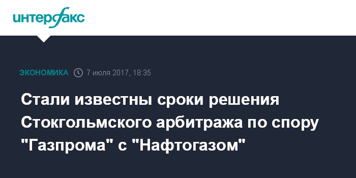 "19 июня 2017 года арбитраж Стокгольма решил, что окончательное решение будет вынесено не позднее 30 ноября 2017 года", - говорится в документе.