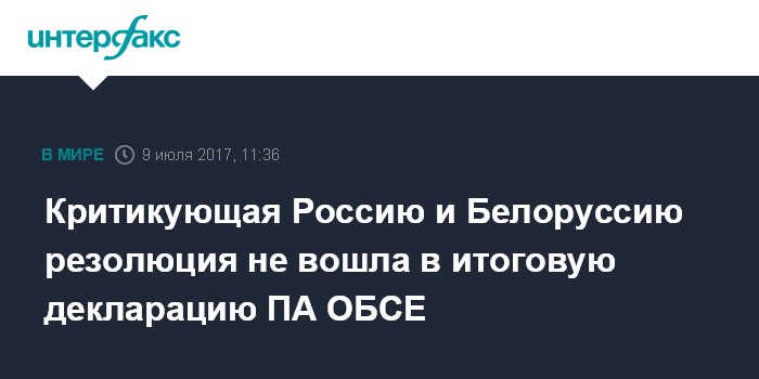 Москва. 9 июля. INTERFAX.RU - Парламентская ассамблея Организации по безопасности и сотрудничеству в Европе (ПА ОБСЕ) отклонила резолюцию о положении в Восточной Европе, она не будет включена в итоговую декларацию, передает корреспондент "Интерфакса".