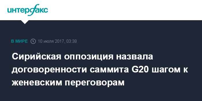 Москва. 10 июля. INTERFAX.RU - Достигнутое президентами РФ и США на саммите G20 соглашение о режиме прекращения огня в ряде юго-западных провинций Сирии окажет положительное влияние на ситуацию и в других регионах страны, а также активизирует женевские переговоры, считает лидер "московской" платформы сирийской оппозиции Кадри Джамиль.