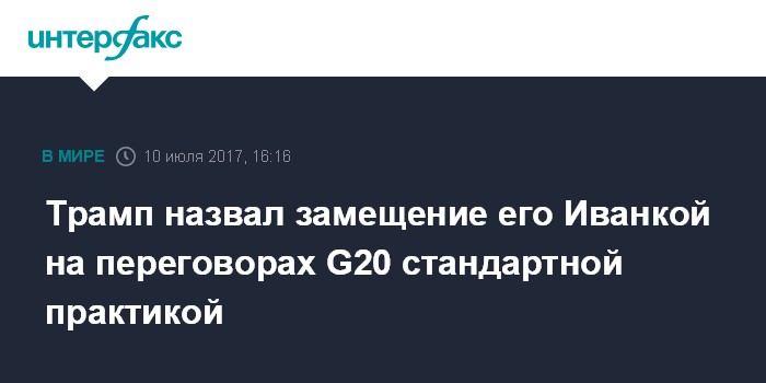 Москва. 10 июля. INTERFAX.RU - Президент США Дональд Трамп заявил что то, что его дочь и по совместительству старший советник Иванка Трамп заняла на некоторое время его место на переговорах мировых лидеров на саммите G20, является стандартной практикой.