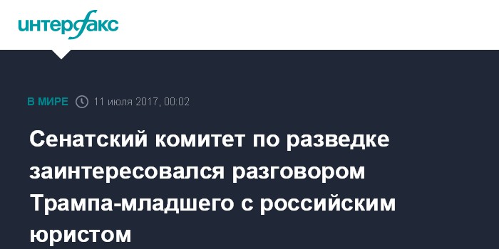 Москва. 10 июля. INTERFAX.RU - Комитет сената конгресса США по разведке заинтересован в разговоре с сыном президента Дональдом Трампом-младшим о его встрече с российским юристом в июне прошлого года, сообщает телеканал NBC News со ссылкой на источник.