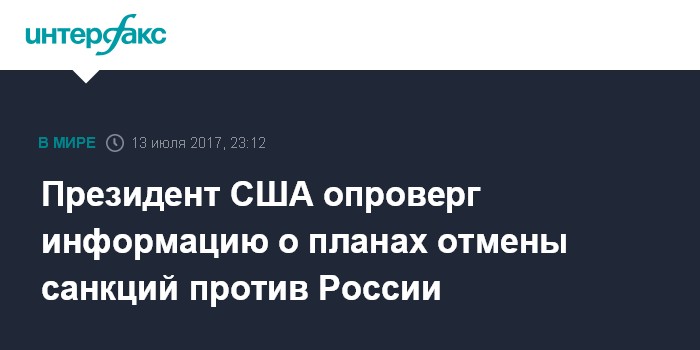 Москва. 13 июля. INTERFAX.RU - Президент США Дональд Трамп опроверг сообщения СМИ о том, что он собирается отменить введенные против России санкции, передает CNBC.