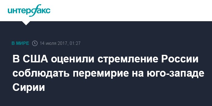 Москва. 14 июля. INTERFAX.RU - Россия дала понять, что настроена серьезно на соблюдение соглашения по перемирию на юго-западе Сирии, заявил спецпредставитель президента США в коалиции по борьбе с "Исламским государством" (запрещено в РФ) Бретт Макгерк.