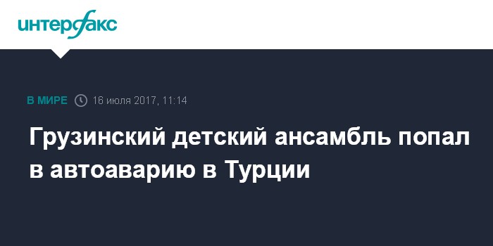 Москва. 16 июля. INTERFAX.RU - Пассажирский автобус, который перевозил в Турции грузинский детский хореографический ансамбль "Лампиреби", попал в ДТП близ города Гиресуна, пострадали 38 человек, сообщает в воскресенье телеканал "Имеди".