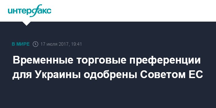 Москва. 17 июля. INTERFAX.RU - Совет ЕС одобрил временные торговые преференции для Украины, которые вступят в силу в конце сентября и будут действовать на протяжении трех лет, говорится в пресс-релизе, опубликованном в понедельник.