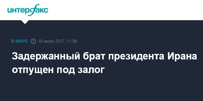 Москва. 18 июля. INTERFAX.RU - Брат президента Ирана Хасана Рухани Ферейдун, который был задержан по подозрению в финансовых преступлениях, отпущен под залог. Об этом сообщает во вторник агентство ИСНА.