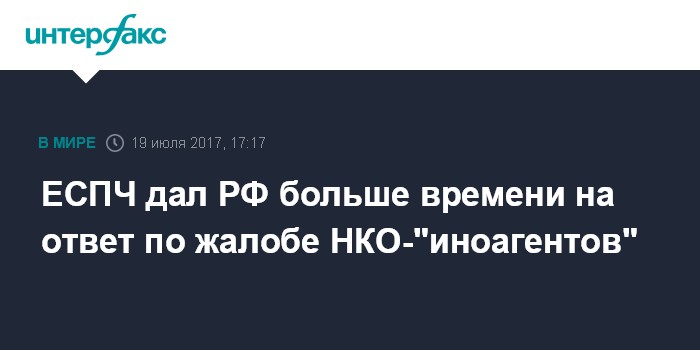 Москва. 19 июля. INTERFAX.RU - Европейский суд по правам человека (ЕСПЧ) предоставил властям России дополнительное время на ответ по жалобе нескольких десятков российских некоммерческих организаций (НКО), оспоривших присвоение им статуса иностранного агента, сообщили в пресс-службе Минюста РФ.