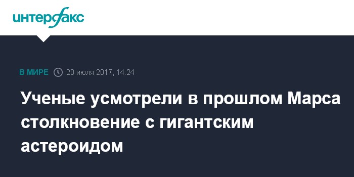 Москва. 20 июля. INTERFAX.RU - Планетологи установили, что Марс в прошлом пережил столкновение с гигантским астероидом, пишет N+1 со ссылкой на журнал Geophysical Research Letters.
