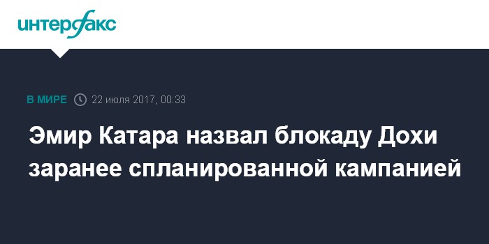 Москва. 22 июля. INTERFAX.RU - Эмир Катара шейх Тамим бен Хамад Аль Тани впервые прокомментировал кризис в отношениях между Дохой и арабским странами, назвав его заранее спланированной кампанией. Обращение эмира в пятницу транслировал канал Al Jazeera.