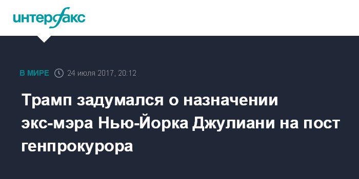 Москва. 24 июля. INTERFAX.RU - Президент США Дональд Трамп может назначить на должность генпрокурора страны экс-мэра Нью-Йорка Рудольфа Джулиани вместо действующего главы Минюста Джеффа Сешнса, сообщает новостное издание Axios.
