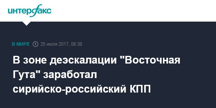 Москва. 25 июля. INTERFAX.RU - Совместный контрольно-пропускной пункт (КПП) российских и сирийских военных начал работу в зоне деэскалации "Восточная Гута" в Сирии.