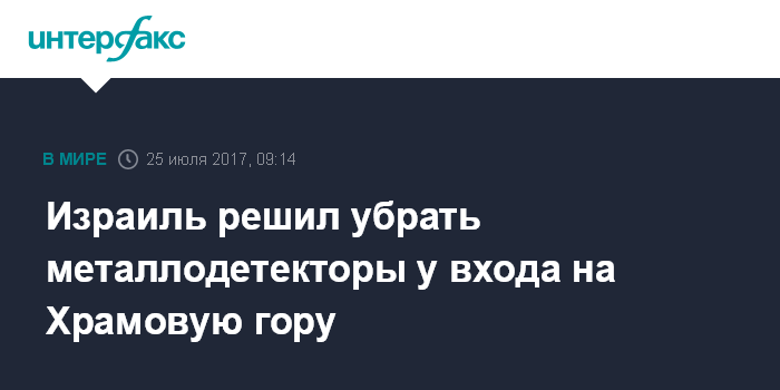 Москва. 25 июля. INTERFAX.RU - Правительство Израиля решило убрать металлодетекторы у входа на Храмовую гору, сообщает The Jerusalem Post.