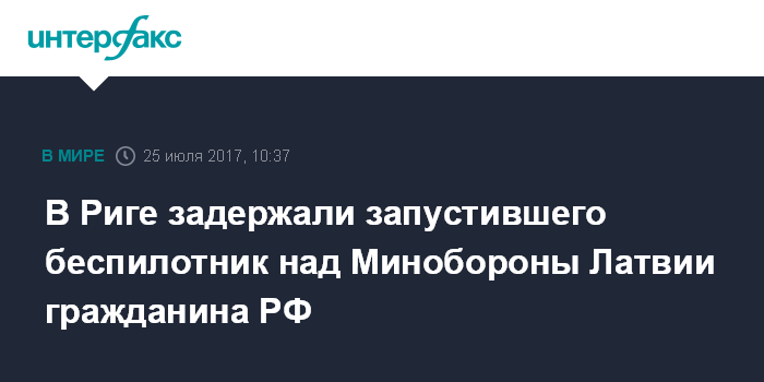 Москва. 25 июля. INTERFAX.RU - Военная полиция задержала российского гражданина за запуск беспилотника над зданием Министерства обороны Латвии. Об этом сообщила агентству BNS представитель Минобороны Сандра Брале.