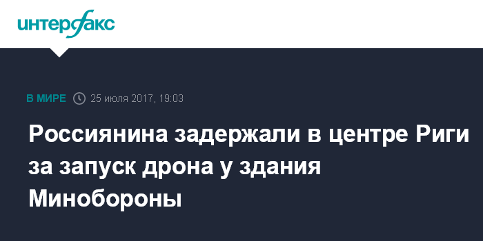 Москва. 25 июля. INTERFAX.RU - Военная полиция Латвии задержала в Риге российского гражданина за запуск беспилотника над зданием Министерства обороны, сообщила во вторник агентству BNS представитель ведомства Сандра Брале.
