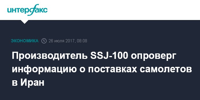 Москва. 26 июля. INTERFAX.RU - Производитель региональных самолетов Sukhoi Superjet 100 АО "Гражданские самолеты Сухого" опроверг появившуюся в иранских СМИ информацию о договоренностях по поставкам лайнеров в Иран.