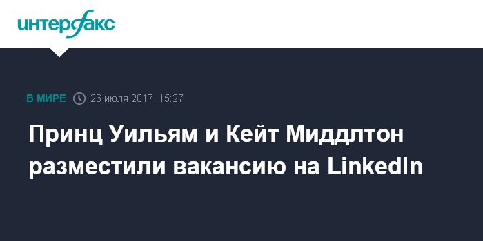 Москва. 26 июля. INTERFAX.RU - Британская королевская семья - герцог Кембриджский Уильям с супругой Кейт Миддлтон и младшим братом принцем Гарри Уэльским - разместила в социальной сети для рекрутинга LinkedIn объявление о вакансии старшего специалиста по коммуникациям Кенсингтонского дворца, на которое откликнулось более 1 тысячи претендентов.