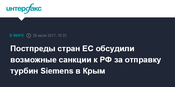 Москва. 26 июля. INTERFAX.RU - Постоянные представители стран ЕС в Брюсселе в среду на заседании своего комитета (Coreper) обсудили предложение для Совета ЕС о возможных санкциях для ряда физических и юридических российских лиц в связи с поставками турбин Siemens в Крым, сообщил "Интерфаксу" дипломатический источник в институтах Евросоюза.