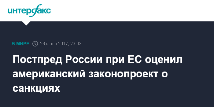 Москва. 26 июля. INTERFAX.RU - Сегодняшняя ситуация с американским законопроектом по санкциям против России - лишь один из этапов законодательной процедуры в США, и, соответственно, реакцию Еврокомиссии на него пока можно считать промежуточной, заявил в интервью "Интерфаксу" постоянный представитель РФ при ЕС Владимир Чижов.