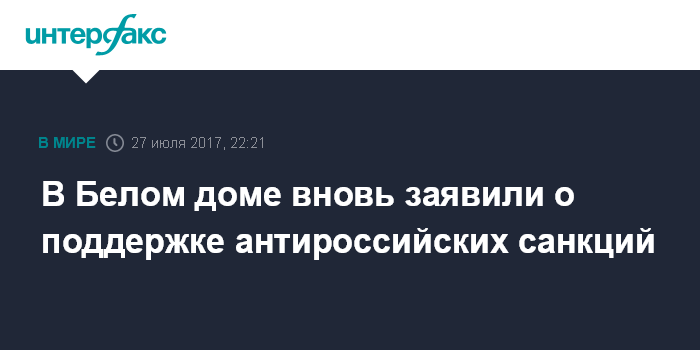 Москва. 27 июля. INTERFAX.RU - Американская администрация во главе с президентом Дональдом Трампом поддерживает антироссийские санкции, а также санкции против КНДР и Ирана, вновь заявила в четверг пресс-секретарь Белого дома Сара Сандерс.