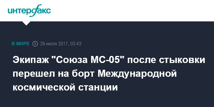 Москва. 29 июля. INTERFAX.RU - Экипаж пилотируемого корабля "Союз МС-05", запущенного с Байконура 28 июля, после проверки герметичности стыковки и выравнивания давления между кораблем и Международной космической станцией (МКС) открыл переходной люк и перешел на борт МКС, сообщил "Интерфаксу" в субботу представитель российского Центра управления полетами (ЦУП).