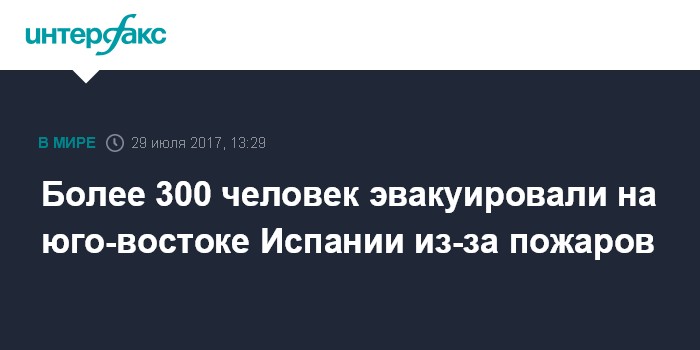 Москва. 29 июля. INTERFAX.RU - Более 300 жителей населенных пунктов на юго-востоке Испании эвакуировали из-за бушующих два дня лесных пожаров, сообщают в субботу местные СМИ.