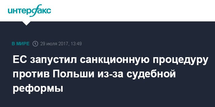 Москва. 29 июля. INTERFAX.RU - Европейский союз запустил санкционную процедуру против Польши из-за судебной реформы, которая, как считают в Брюсселе, подрывает независимость судебной системы в стране, говорится в заявлении Европейской комиссии.
