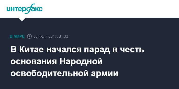 Москва. 30 июля. INTERFAX.RU - Первый с 1949 года парад в честь дня основания Народной освободительной армии Китая начался в на тренировочной базе в провинции Внутренняя Монголия, сообщило в воскресенье агентство "Синьхуа".