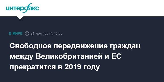 Москва. 31 июля. INTERFAX.RU - Свободное передвижение между странами британских подданных и граждан Европейского союза будет прекращено весной 2019 года, сообщили в понедельник британские СМИ со ссылкой на заявление представителя премьер-министра Великобритании Терезы Мэй.