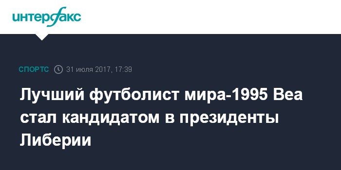 Москва. 31 июля. INTERFAX.RU -Известный в прошлом футболист Джордж Веа стал одним из 20 кандидатов, которые в понедельник начинают борьбу за пост президента Либерии, сообщают западные СМИ.