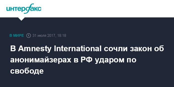 Москва. 31 июля. INTERFAX.RU - Подписанный президентом России закон о запрете анонимайзеров и виртуальных частных сетей (VPN) является серьезным ударом по свободе Интернета в России, заявили в Amnesty International.